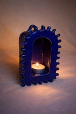 Handmade ceramic candle lantern in a rich cobalt blue glaze, designed as both a sculptural accent and a functional light piece. This unique ceramic altar lantern works beautifully as ambient lighting while also serving as a striking decorative object.